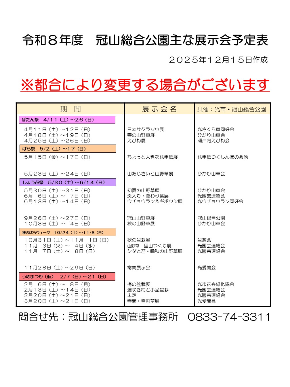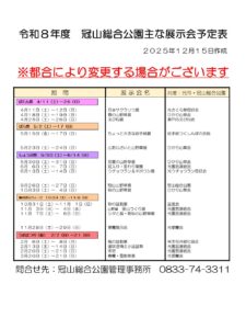 【令和8年度冠山総合公園主な展示会予定表】