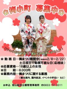 ◎勤務日・・・梅まつり期間中(令和8年2/8~2/22)の土日祝日で、本人が勤務を希望する日(応相談)