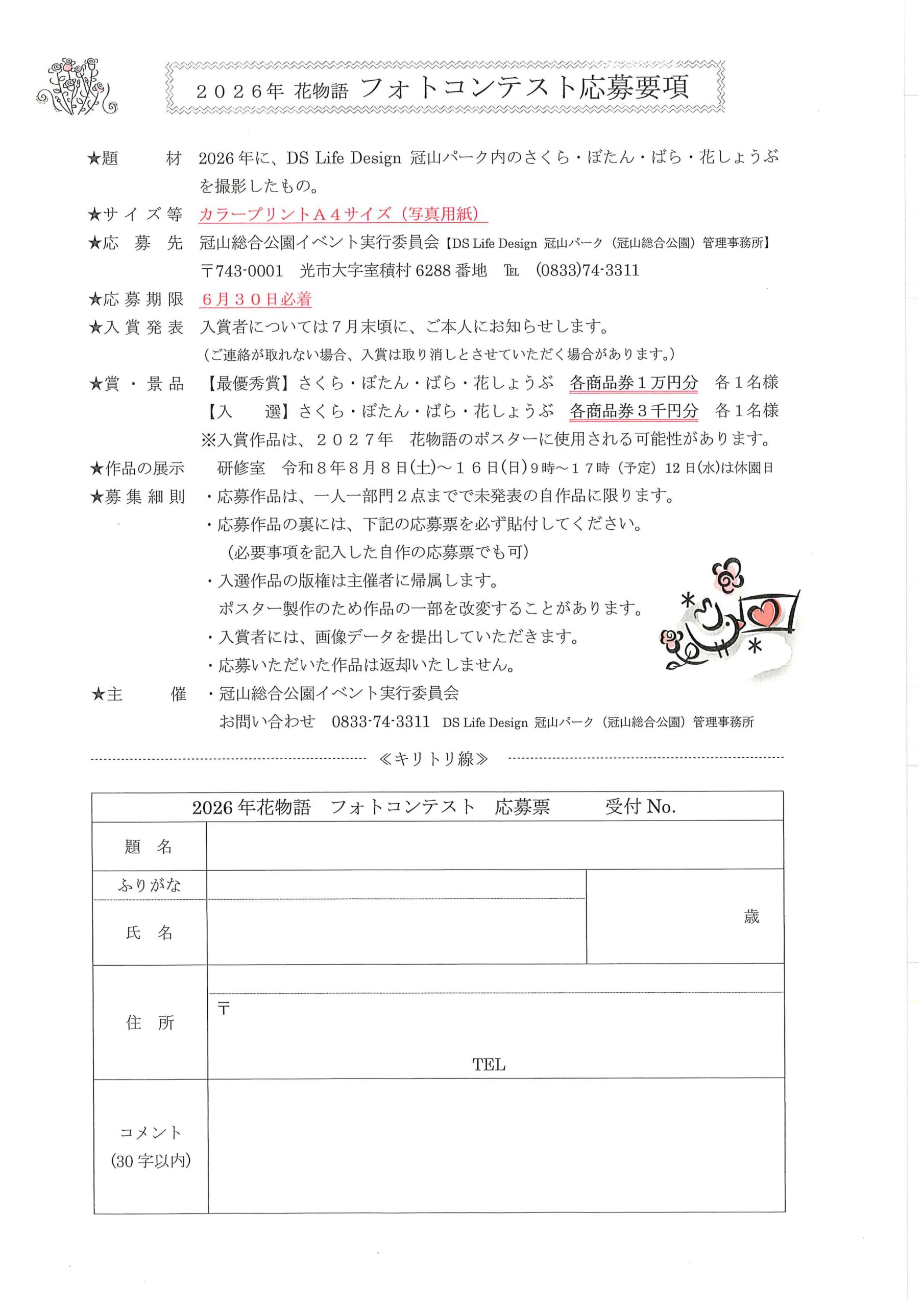 DS Life Design 冠山パーク内のさくら・ぼたん・ばら・花しょうぶを撮影した写真をご応募いただいた方の中から、最優秀賞・入選を選出します。